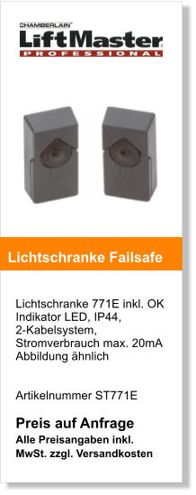 Lichtschranke inkl. LED Indikator, IP56, Spannung -6V; kompatibel mit CB3 & allen Liftmaster Garagentorantrieben,  Sender, Empfänger,  Artikelnummer ST770E  Preis auf Anfrage  Alle Preisangaben inkl. MwSt. zzgl. Versandkosten    Lichtschranke Failsafe Reflektionslichtschranke, Reichtweite ca. 8,00m, IP67 VU12-240V/DC bzw. 24-240V/AC, 1 Wechselkontakt Abbildung ähnlich     Artikelnummer BS126.05  Preis auf Anfrage  Alle Preisangaben inkl. MwSt. zzgl. Versandkosten    Reflektor Lichtschranke Warnleuchte orange,  24V / 10-15W, nur für getaktete Ausgänge ( ohne Blinkautoamtik) für Modell: G501, G402, D1000, S2000   Artikelnummer BS440.401  Preis auf Anfrage  Alle Preisangaben inkl. MwSt. zzgl. Versandkosten    Warn-u. Blinkleuchte Warnleuchte orange, 230V /15W, mit integrierter Blinkelektronik, nur für nicht getaktete Ausgänge, für Modell: G501, G402, D1000, S2000 Artikelnummer BS440.403  Preis auf Anfrage  Alle Preisangaben inkl. MwSt. zzgl. Versandkosten    Warn-u. Blinkleuchte Ampelmodul / Einbahnregelung zur Erweiterung ihres Bernal-Antriebes um eine Ampelanlage, z.B: Tiefgarage   Artikelnummer BS   Preis auf Anfrage  Alle Preisangaben inkl. MwSt. zzgl. Versandkosten    Ampelmodul Durchgangsleiste, 1000m Länge, EPDM, Profil 35x65mm auf C-Profil  Schiene 35x14mm Abbildung ähnlich    Artikelnummer BS123.100D  Preis auf Anfrage  Alle Preisangaben inkl. MwSt. zzgl. Versandkosten    Durchgangsleiste Signalübertragung 868 Sender, TBX, 1 Kanal, für 1 Schaltleiste 8,2Ohm oder Stop-Kontakt, 868 Mhz,  Reichweite ca. 10m , IP67   Artikelnummer BS160.660  Preis auf Anfrage  Alle Preisangaben inkl. MwSt. zzgl. Versandkosten    Signalübertragung Send Signalübertragung Empfänger, RU, 2 Kanal,  für bis zu 3 Sender, 868 Mhz, Reichweite max. ca. 10m, IP67, 12-24V/AC/DC   Artikelnummer BS160.661  Preis auf Anfrage  Alle Preisangaben inkl. MwSt. zzgl. Versandkosten    Signalübertragung Empf Signalampel grün oder rot, Linsendurchmesser 120mm schlagfestes Gehäuse IP65, inkl. Befestigungsbügel, Leuchtmittel nicht enthalten Abbildung ähnlich    Artikelnummer BS139.7  Preis auf Anfrage  Alle Preisangaben inkl. MwSt. zzgl. Versandkosten    Signalampel Codeschloss, 4 Kanal, 868,5 mHz; IP65, ähnl. RAL7012 basaltgrau, 9V Block Batterie      Artikelnummer BS161.45-S  Preis auf Anfrage  Alle Preisangaben inkl. MwSt. zzgl. Versandkosten    Funkcodeschloss Pico Codeschloss, 3+ 1 Kanal,868,5 mHz; IP54, ähnl. RAL7035 lichtgrau,Manipulationssichere Ausführung, 9V Block     Artikelnummer BS161.45  Preis auf Anfrage  Alle Preisangaben inkl. MwSt. zzgl. Versandkosten    Funkcody  Pico 868,5 Lichtschranke 771E inkl. OK Indikator LED, IP44, 2-Kabelsystem, Stromverbrauch max. 20mA Abbildung ähnlich    Artikelnummer ST771E  Preis auf Anfrage Alle Preisangaben inkl. MwSt. zzgl. Versandkosten    Lichtschranke Failsafe Lichtschranke 772E IP44, Reichweite ca. 15m,  2-Kabelsystem, kompatibel mit allen Dreh-Schiebetorsteuerungen und Garagentorantrieben   Artikelnummer ST772E  Preis auf Anfrage Alle Preisangaben inkl. MwSt. zzgl. Versandkosten    Lichtschranke Failsafe Vandalismusschutz für 772E/773E       Artikelnummer ST829  Preis auf Anfrage Alle Preisangaben inkl. MwSt. zzgl. Versandkosten    Vanalismusschutz Failsafe Infrarot Lichtschranken Kit für Liftmaster Garagentor- und Aussentorantriebe inkl. LED Indikator, Wandbeschlägen, Kabel   Artikelnummer ST771K  Preis auf Anfrage Alle Preisangaben inkl. MwSt. zzgl. Versandkosten    Lichtschranken Kit Endleiste m. Abschlusswiderstand 1000m Länge, EPDM; Profil 35x65mm auf C-Profil, Schiene 35x14mmAbbildung ähnlich  Artikelnummer BS123.100  Preis auf Anfrage  Alle Preisangaben inkl. MwSt. zzgl. Versandkosten    Kontakt / Endleiste Lichtschranke 773 Relais infrarot Lichtschranke IP44, Reichweite ca. 20m,  2-Kabelsystem,für CB11,CB22,CB400 inkl. LED Indikator   Artikelnummer ST773  Preis auf Anfrage Alle Preisangaben inkl. MwSt. zzgl. Versandkosten    Lichtschranke Relais Unser Shop dient als  Katalog.  Bei Bestellungen,  Fragen oder sonstiges  einfach anrufen oder  mailen   0 68 38 / 92 64 6 info@schober-torantriebe.com Torantriebe e.K.  SCHOBER